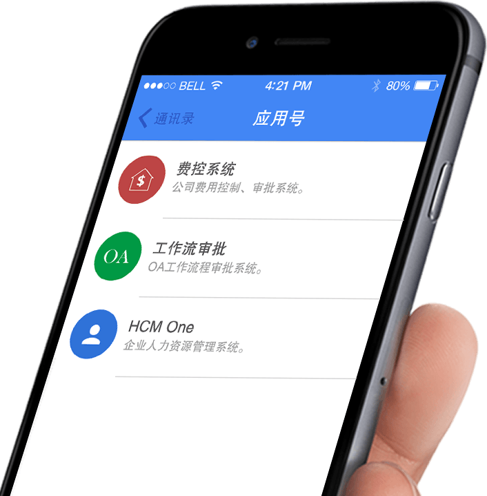 移动工作门户不能没有企业应用。你不需要为每个企业应用开发一个 App,用企业应用号轻松接入。